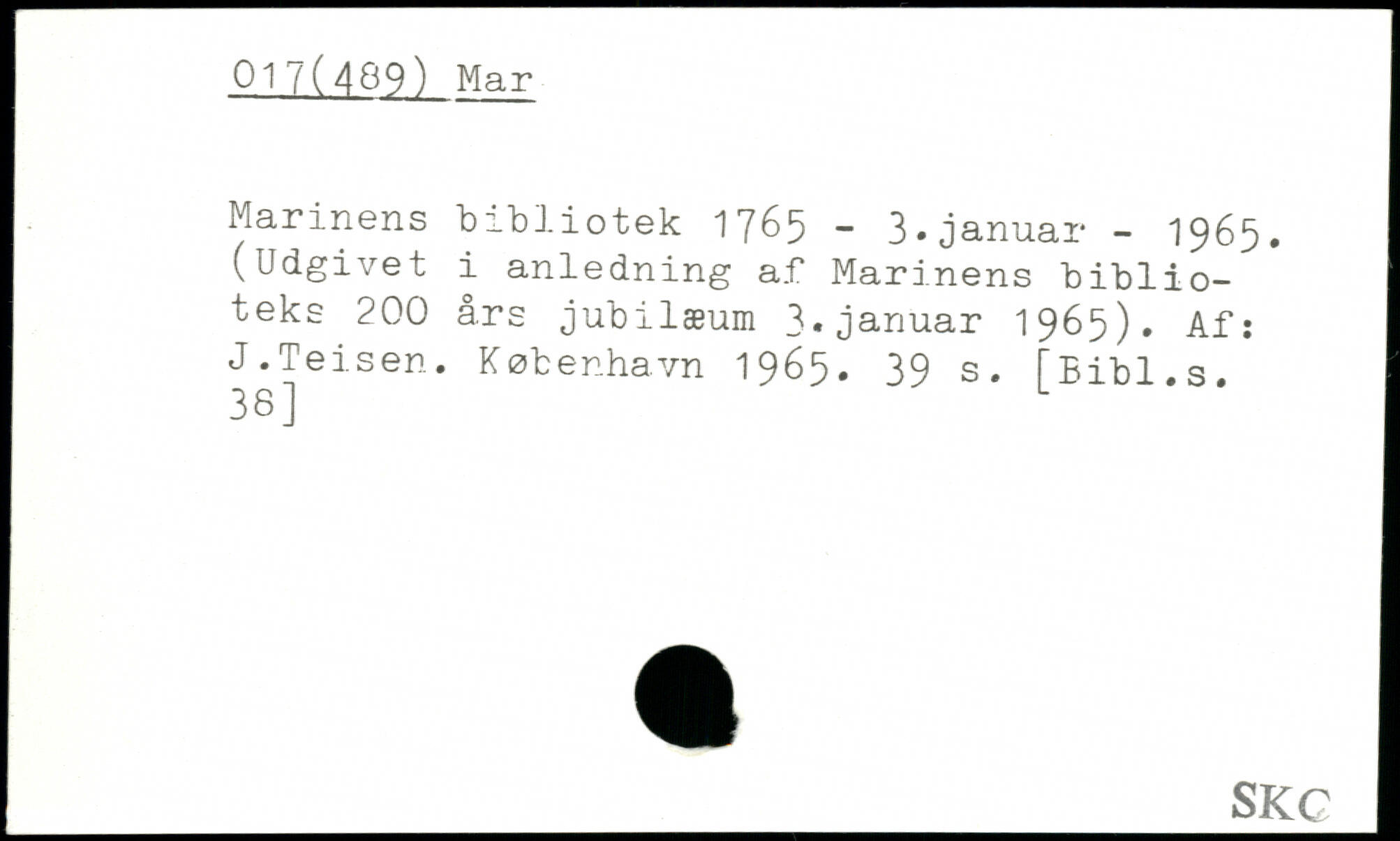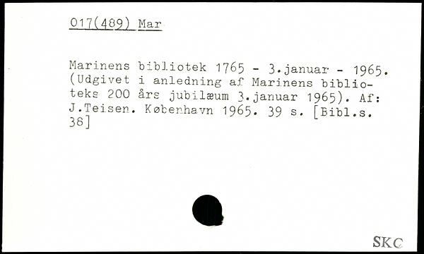 Marinens bibliotek 1765 - 3.januar - 1965. (Udgivet i anledning af Marinens biblioteks 200 ars jubilæum 3,januar 1965). Af: J.Teisen.