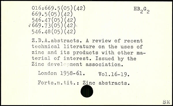 Z.D.A.abstracts. A review of recent technical literature on the uses of zinc and its products with other material of interest. Issued by the Zinc development association.