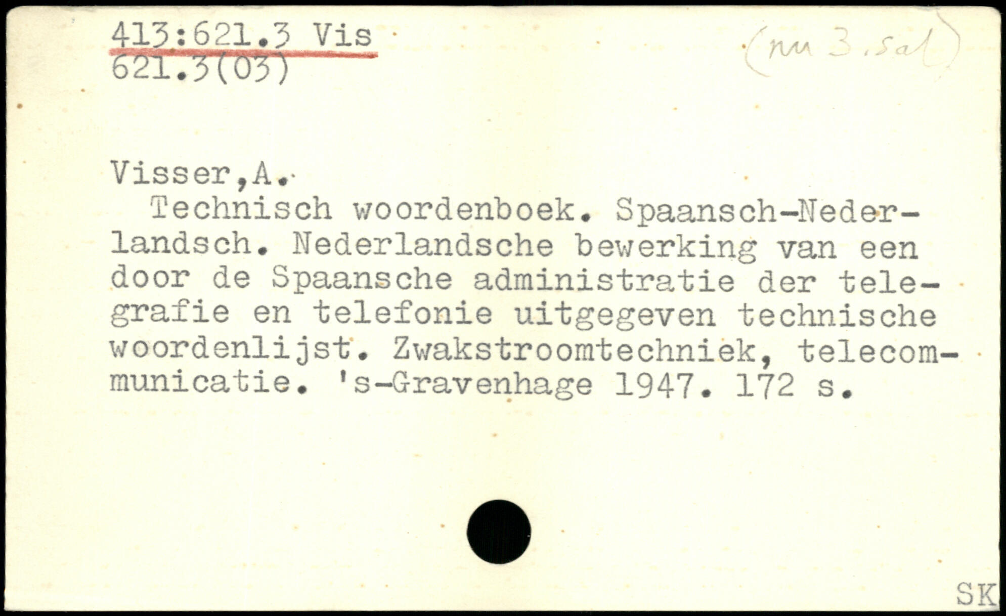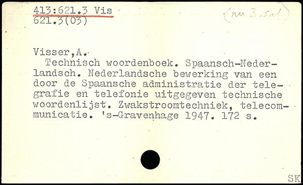Technisch woordenboek. Spaansch-Neder-landsch. Nederlandsche bewerking van een door de Spaansche administratie der tele-grafie en telefonie uitgegeven technische woordenlijst. Zwakstroomtechniek, telecom-. municatie. . s-G-ravenhage 1947.