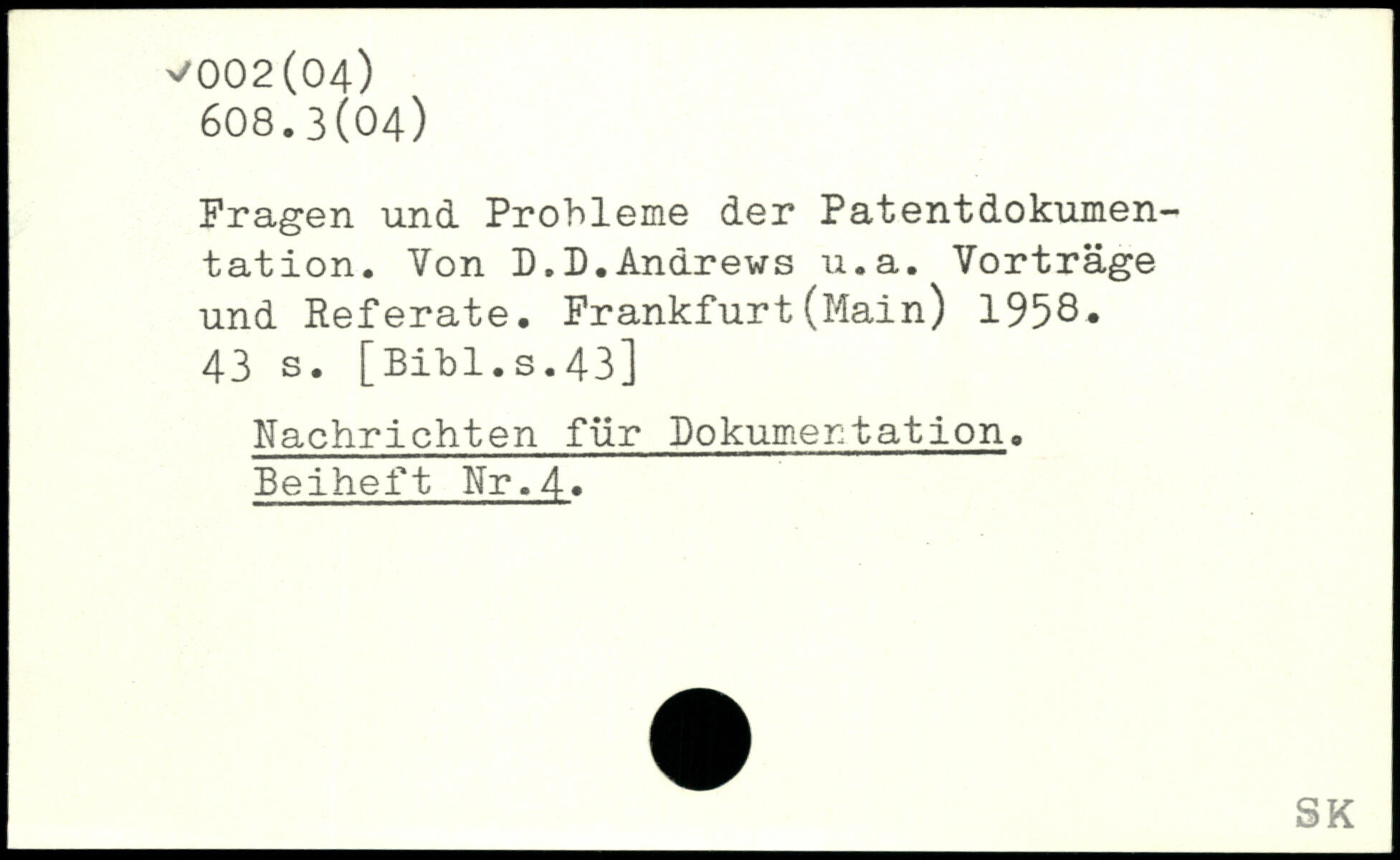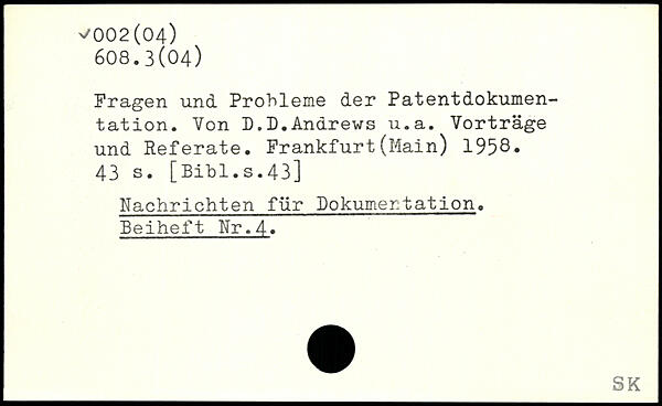 Fragen und Probleme der Patentdokumentation. Von D.D.Andrews u.a. Vorträge und Referate. Frankfurt(Main) 1958