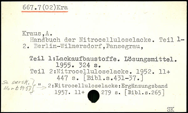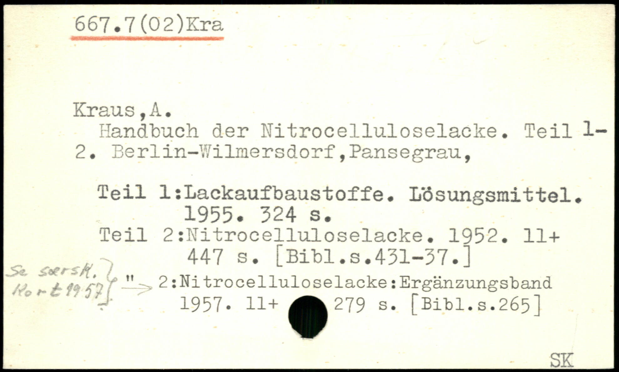 Handbuch der Nitrocelluloselacke. Teil 1-2. Berlin-Wilmersdorf,Pansegrau, Teil 1:Lackaufbaustoffe. Lösungsmittel. 1955.
