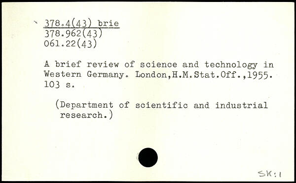 A brief review of science and technology in Western Germany. London,H.M.Stat.Off.,1955.