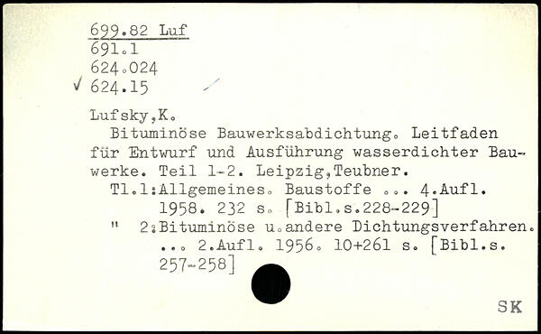 Luf sky,K o Bituminöse Bauwerksabdichtung. Leitfaden für Entwurf und Ausführung wasserdichter Bauwerke. Teil 1-2. Leipzig,Teubner. TI.1:Allgemeineso Baustoffe ...
