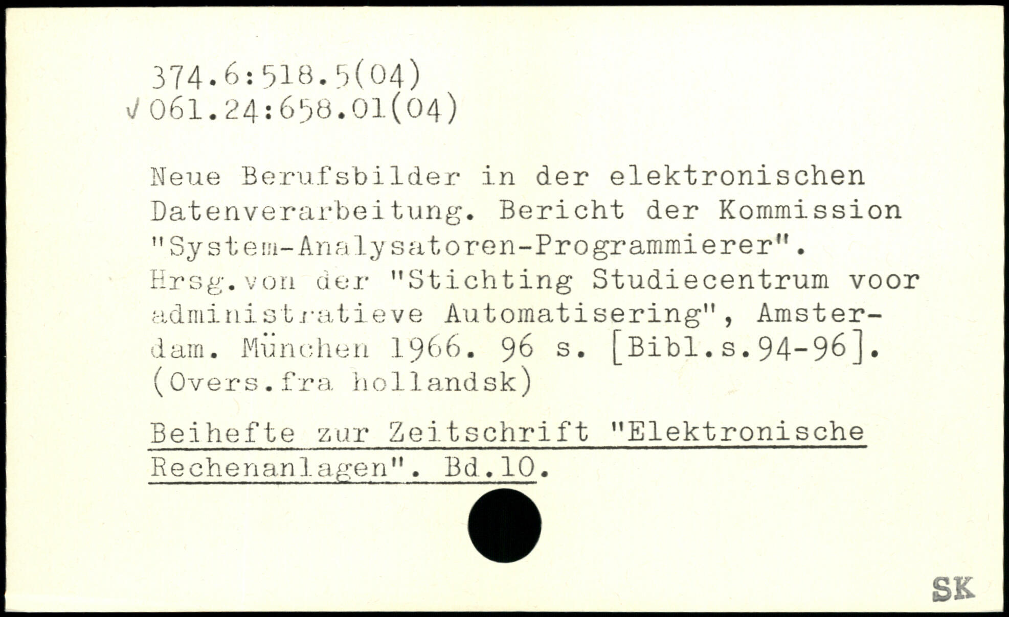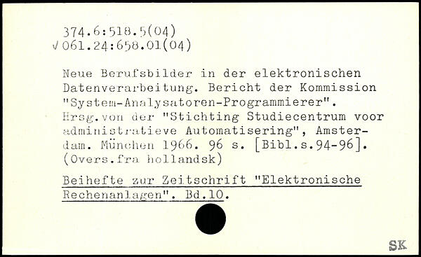 Neue Berufsbilder in der elektronischen Datenverarbeitung. Bericht der Kommission "System-Analysatoren-Programmierer". Hrsg.von der "Stichting Studiecentrum voor administratieve Automatisering", Amsterdam.