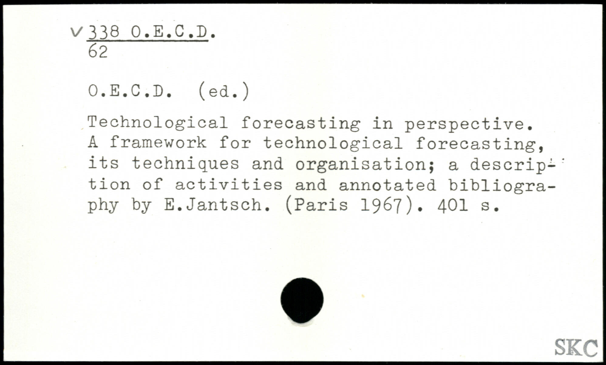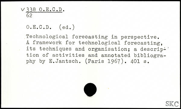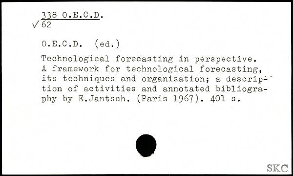 Technological forecasting in perspective. A framework for technological forecasting, its techniques and organisation; a descrip-' tion of activities and annotated bibliography by E.Jantsch. (