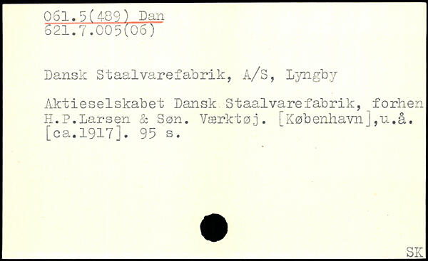 Dansk Staalvarefabrik, A/S, Lyngby Aktieselskabet Dansk Staalvarefabrik, forhen H.P.Larsen & Søn. Værlctøj. [Københavnj,u.å. [ca.1917].