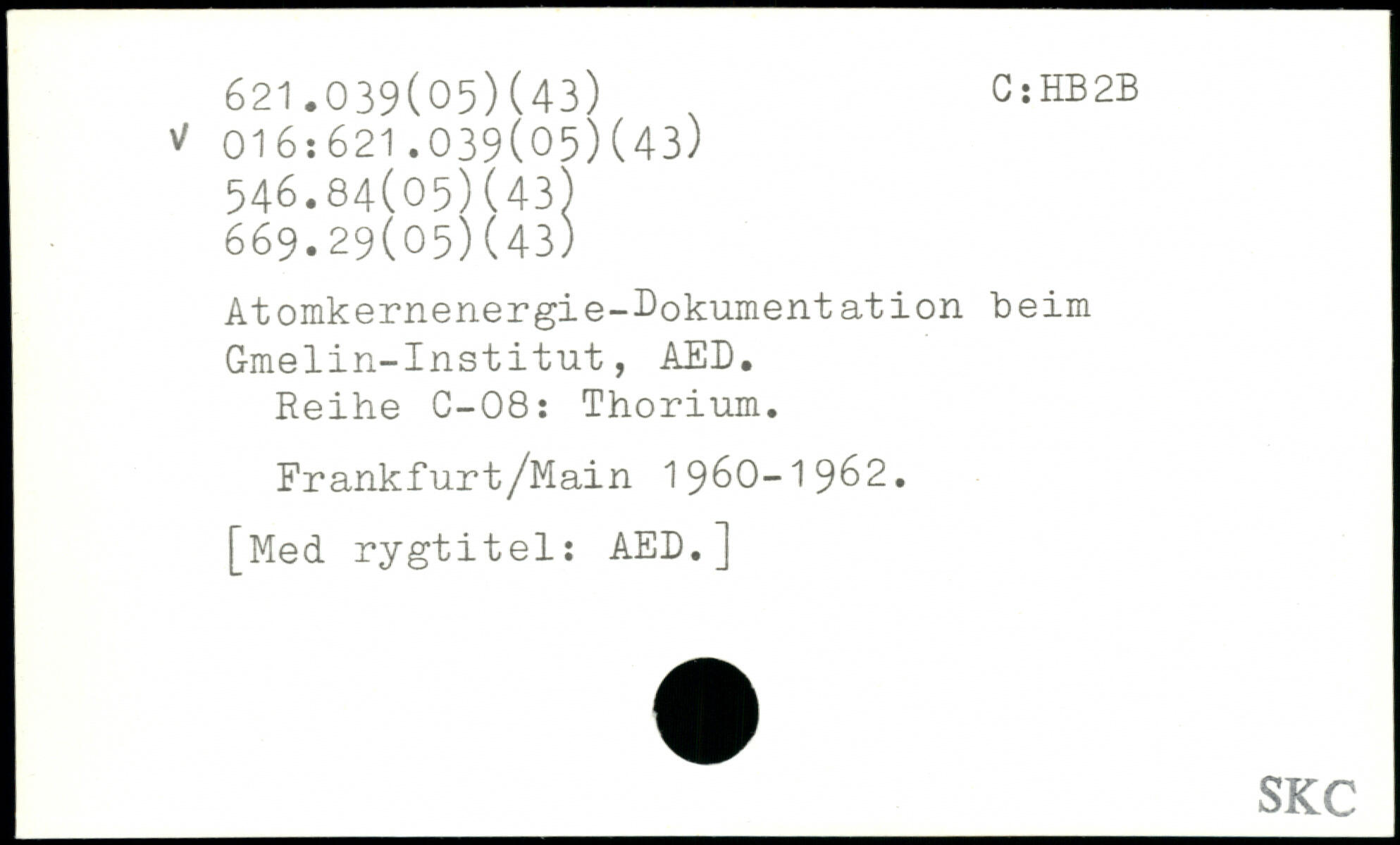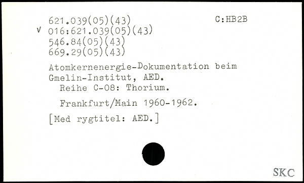 Atomkernenergie-dokumentation beim Gmelin-Institut, AED. Reihe C-08: Thorium. Frankfurt/Main 1960-1962.