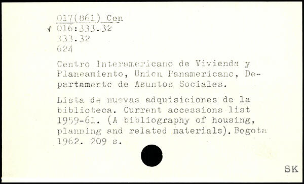 Centro Interamericano de Vivienda y Planeamiento, Union Panamericanc , De-partamentc de Asuntos Sociales. Lista de nuevas adquisioion.es de la biblioteca. Current accessions list 1979-61. (A bibliography of housing, planning and related materials). Bogota 1902.