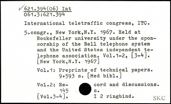 International teletraffic congress, ITC. 5,congr., New York,N.Y. 1967. Held at Rockefeller university under the sponsorship of the Bell telephone system and the United States independent telephone association.