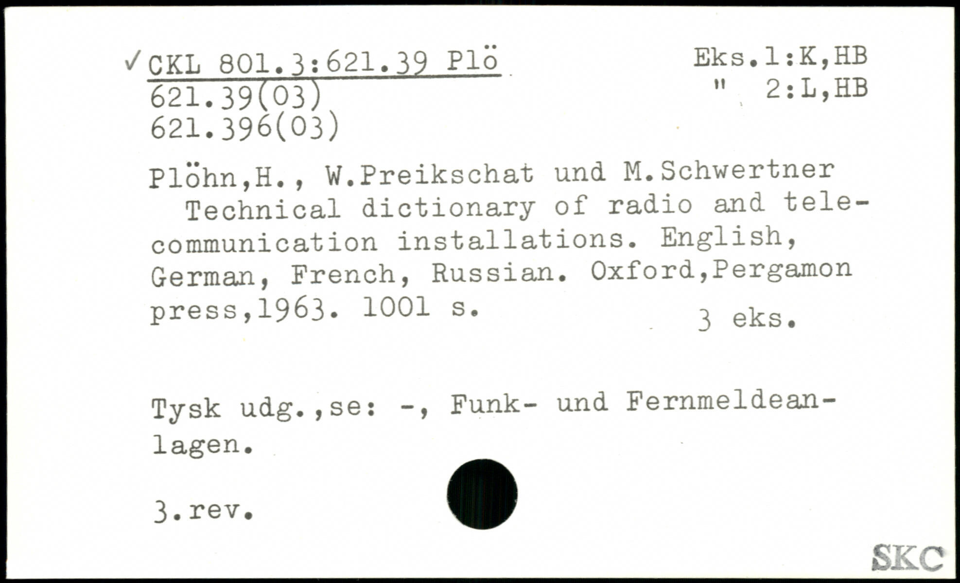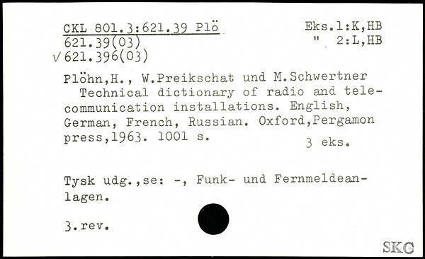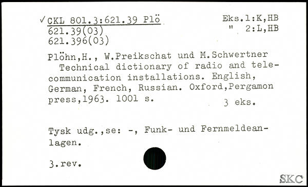 Plöhn,H., W.Preikschat und M.Schwertner Technical dictionary of radio and telecommunication installations. English, German, French, Russian.