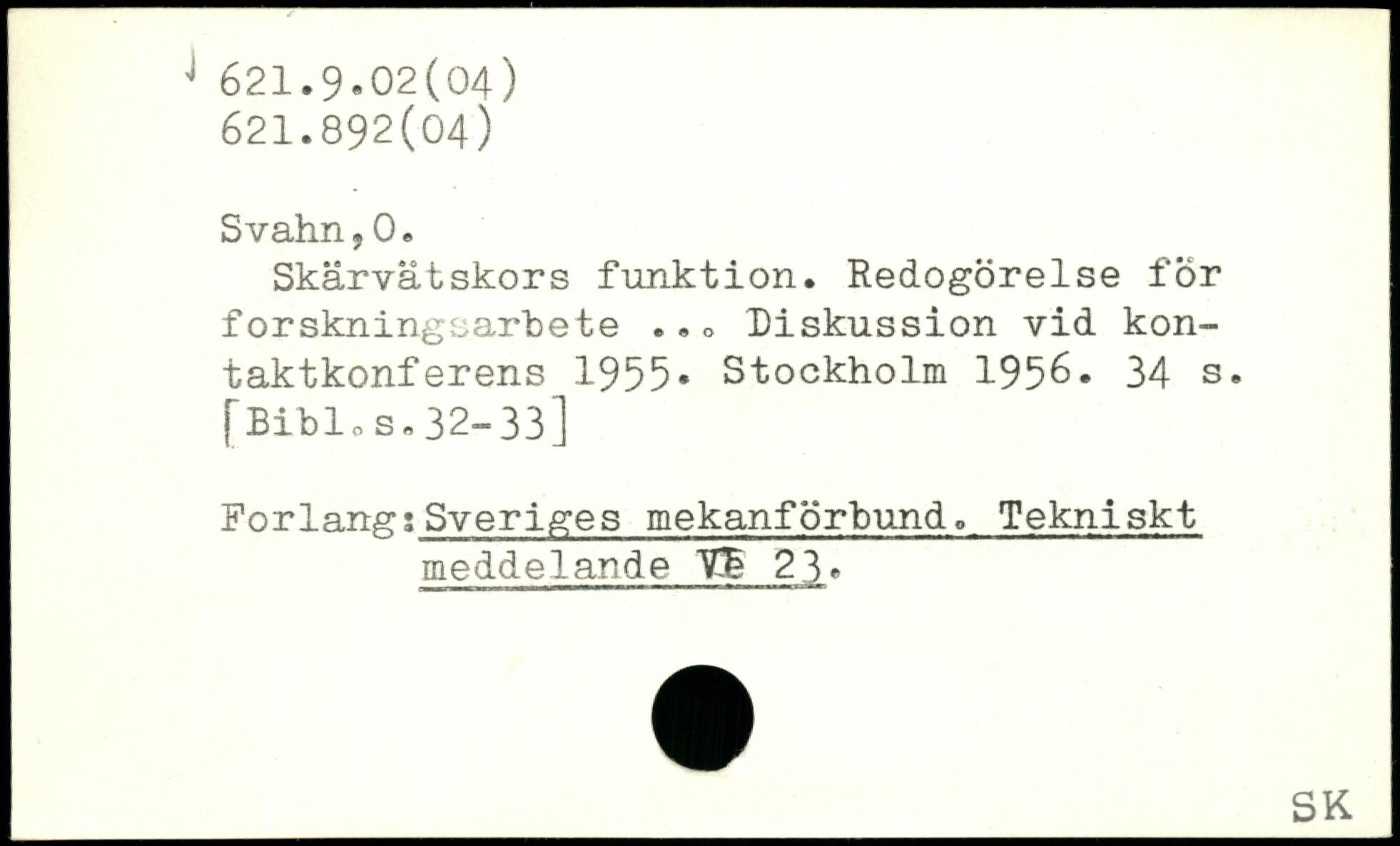 Skärvätskors funktion. Redogörelse för forskningsarbete .Diskussion vid kontaktkonferens 1955