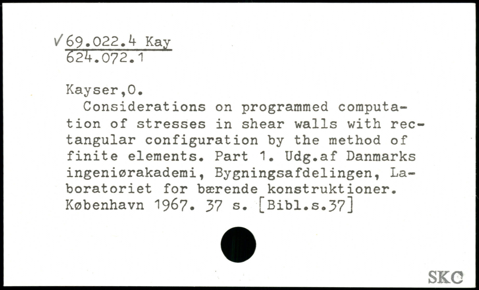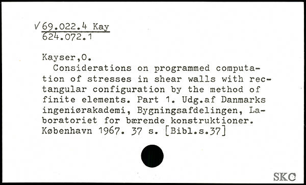 Considerations on programmed computation of stresses in shear walls with rectangular configuration by the method of finite elements. Part 1. Udg.af Danmarks ingeniørakademi, Bygningsafdelingen, Laboratoriet for bærende konstruktioner.