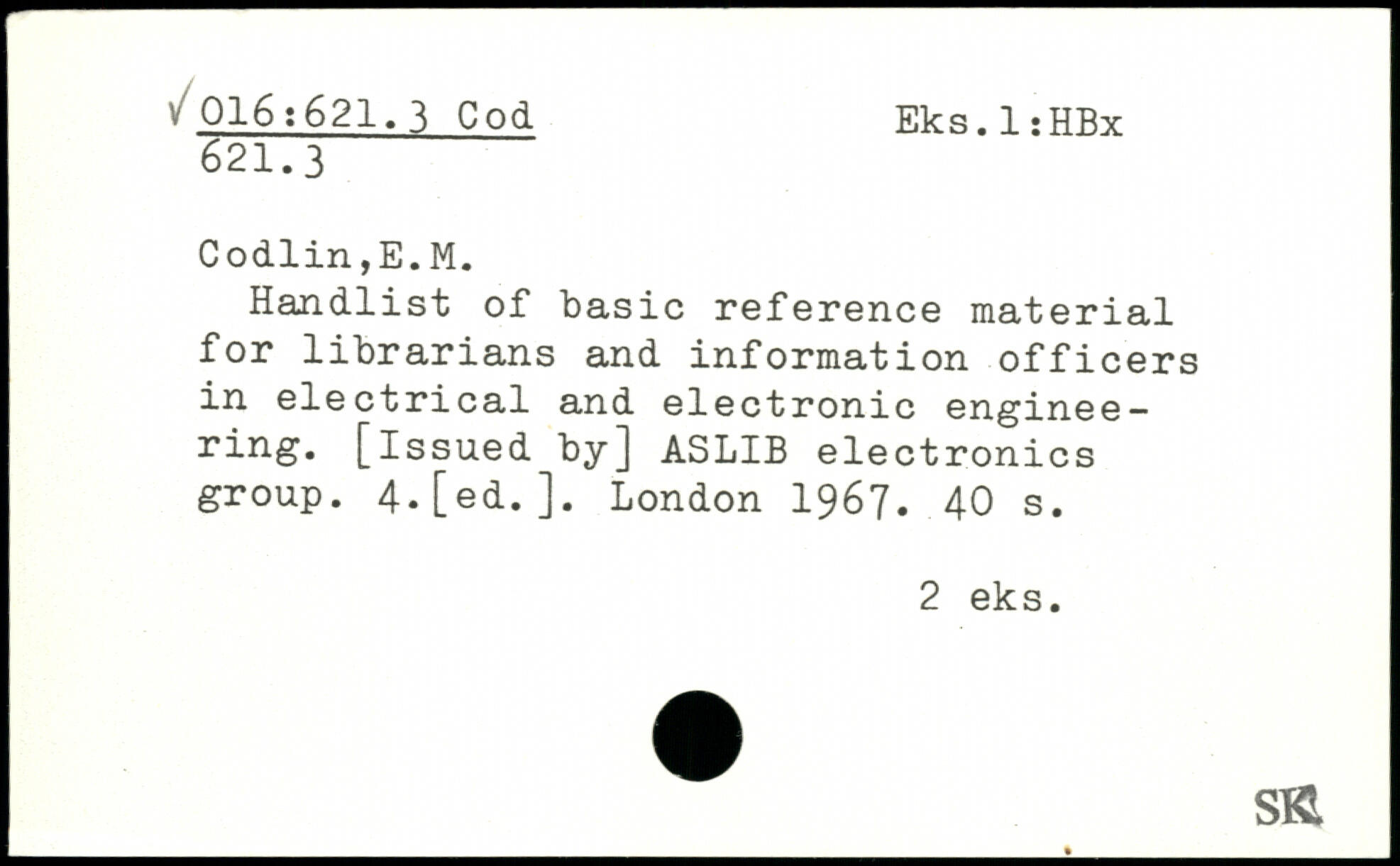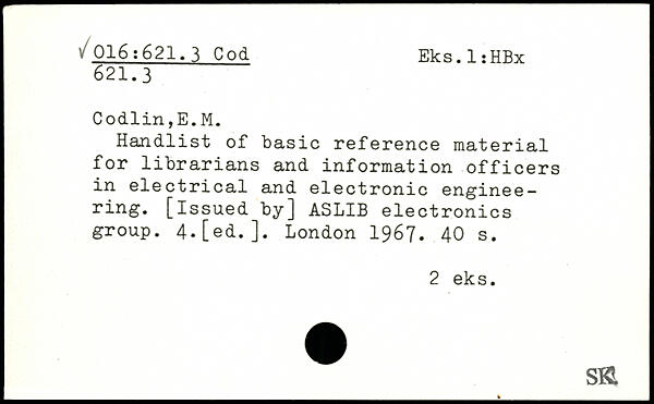 Handlist of basic reference material for librarians and information officers in electrical and electronic enginee-ring. [issued by] ASLIB electronics group. 4.[ed.].
