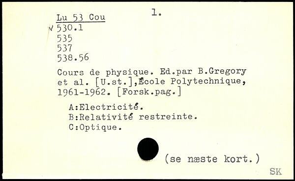 Cours de physique. Ed.par B.Gregory et al. [U.st.],École Polytechnique, 1961-1962. [Porsk.pag.] AîElectricité. BrRelativitë restreinte. C : Optique.