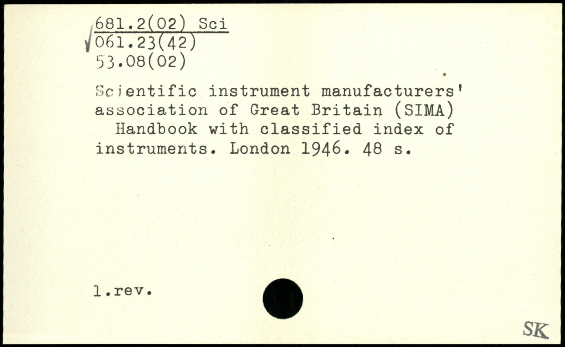 Scientific instrument manufacturers’ association of Great Britain (SIMA) Handbook with classified index of instruments. London 194-6.