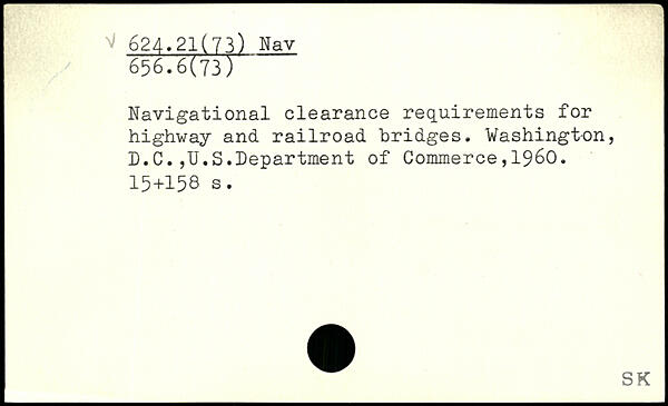 Navigational clearance requirements for highway and railroad bridges. Washington, D.C.,U.S.Department of Commerce,1960.