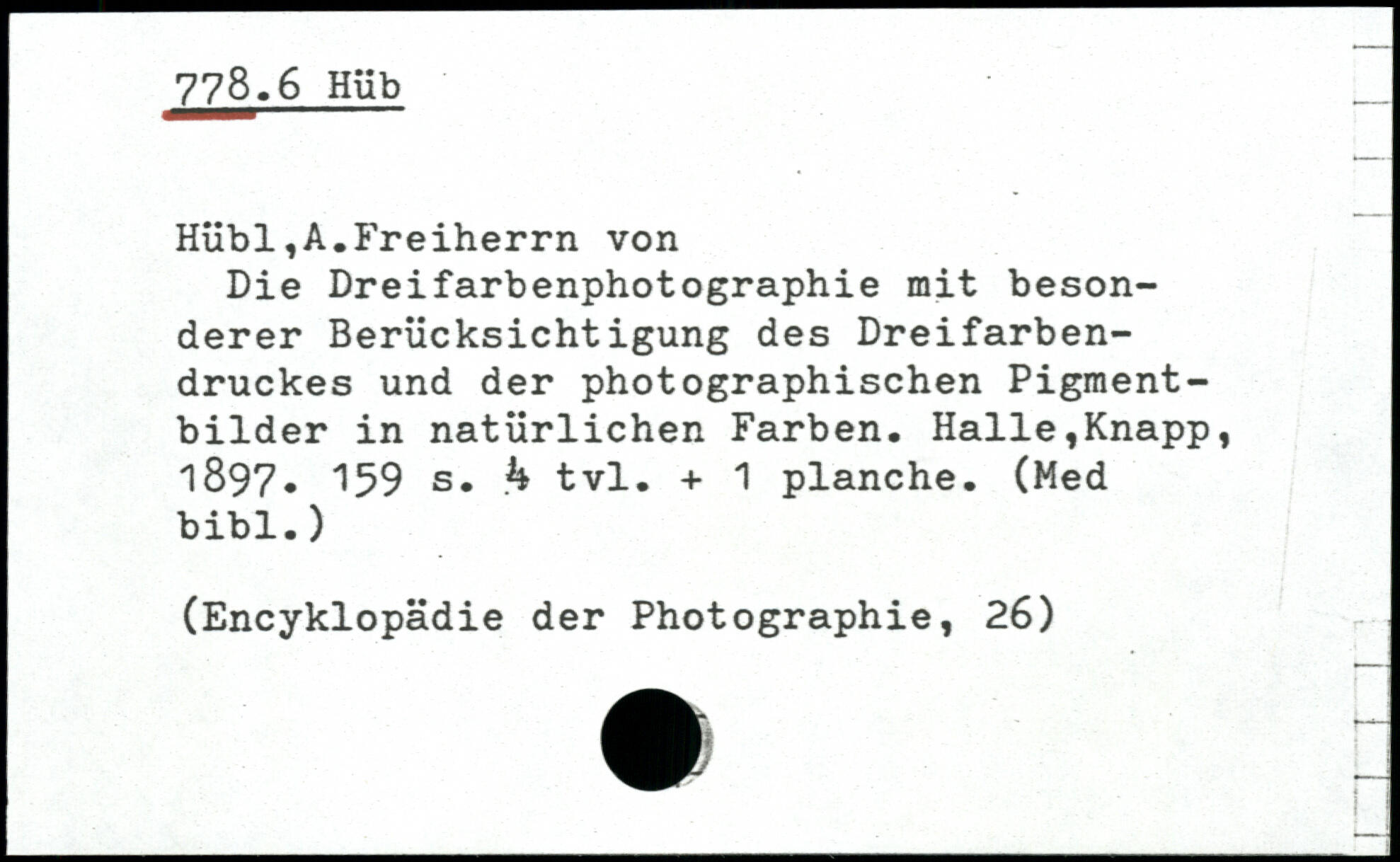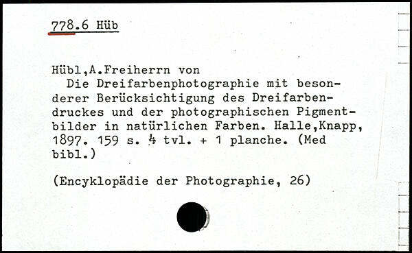 Hübl,A.Freiherrn von Die Dreifarbenphotographie mit besonderer Berücksichtigung des Dreifarbendruckes und der photographischen Pigmentbilder in natürlichen Farben.