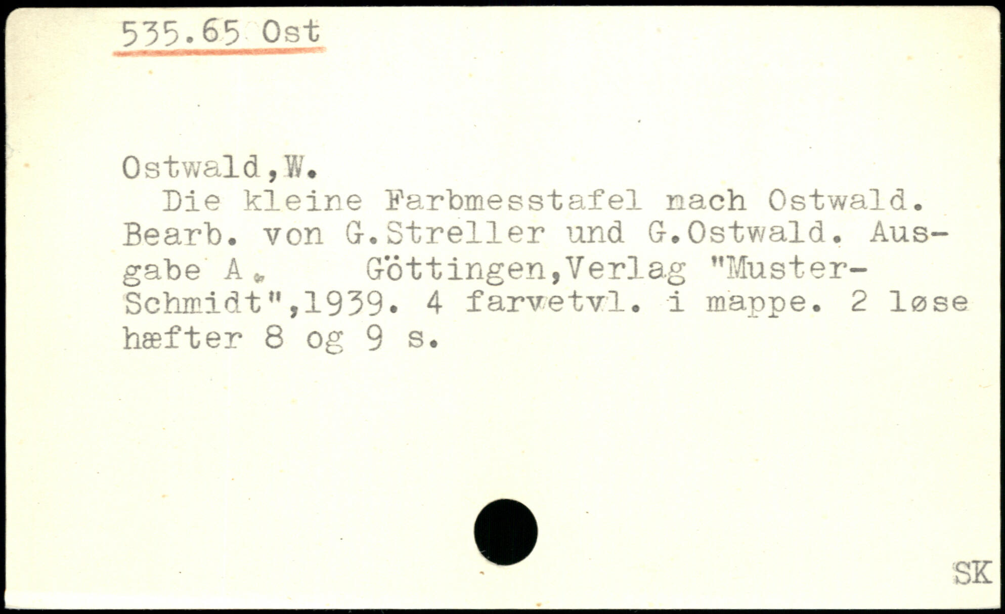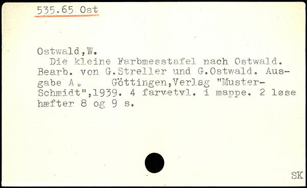 Die kleine Farbmesstafel nach Ostwald. Bearb. von G.Streller und G.Ostwald, Ausgabe A, Gottingen,Verlag ”Muster- Schmidt M,1939. 4 farvetvl. i mappe. 2 løse hæfter 8 og
