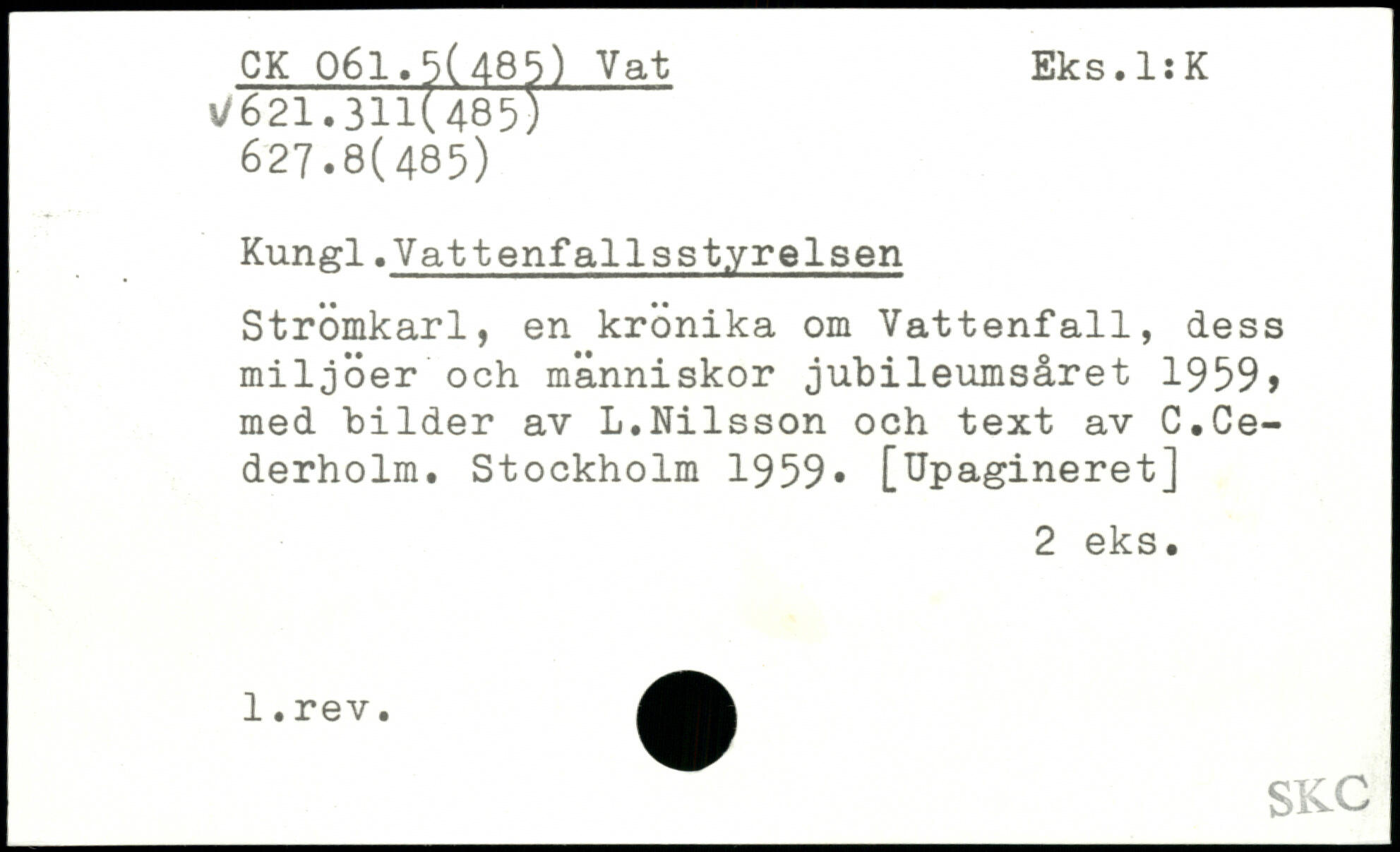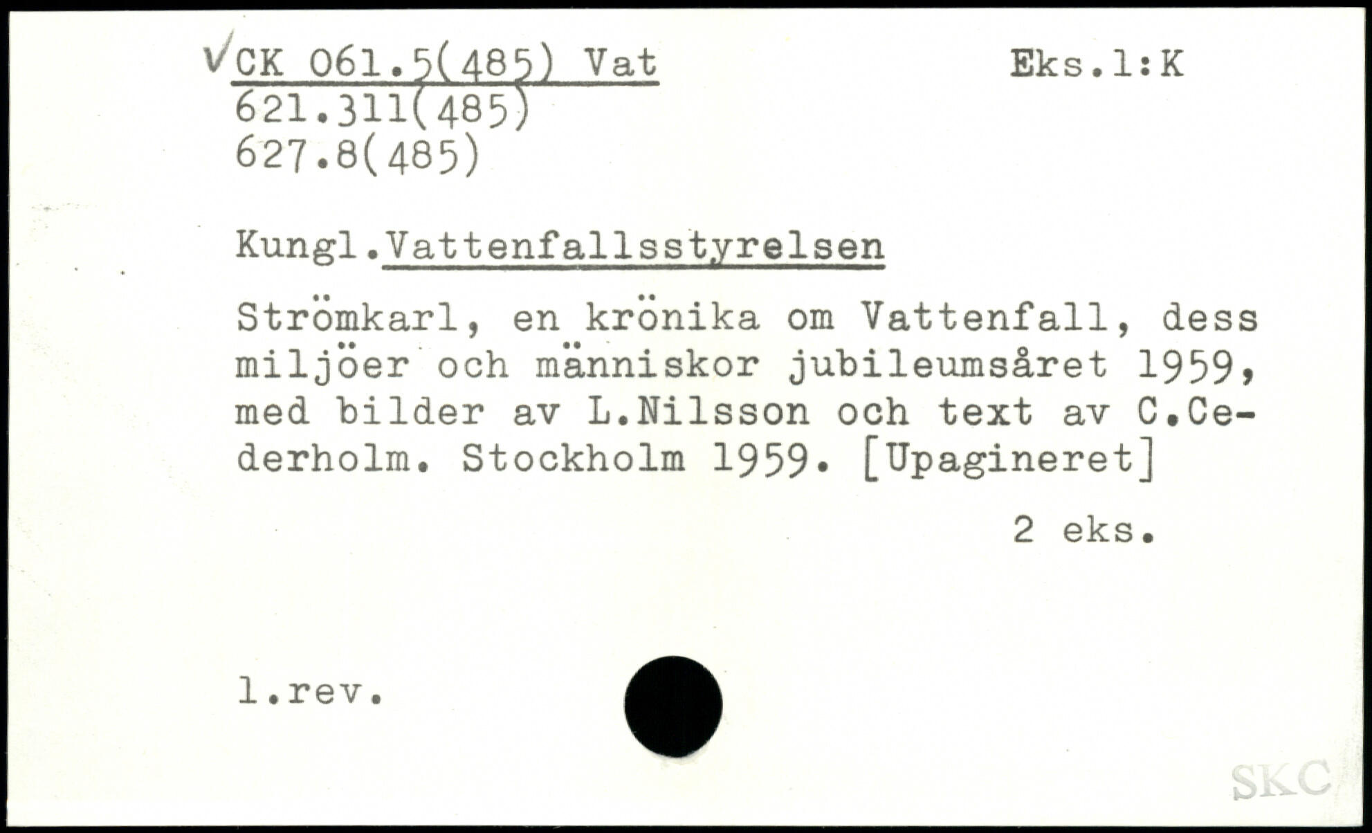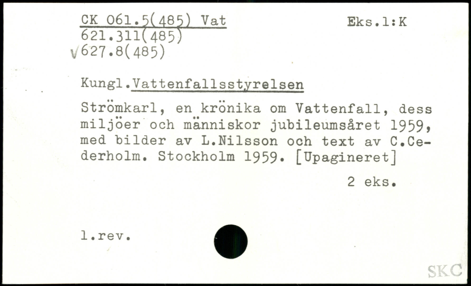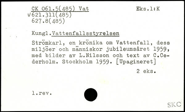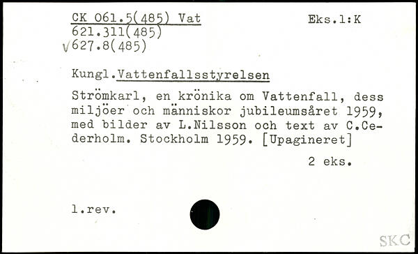 Kungl.Vattenfallsstyrelsen Strömkarl, en krönika om Vattenfall, dess miljöer och människor jubileumsåret 1959, med bilder av L.Nilsson och text av C.Cederholm.