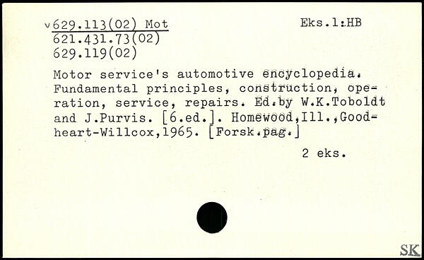 Motor service's automotive encyclopedia. Fundamental principles, construction# operation, service, repairs. Ed#by W.K.Toboldt and J.Purvis. [