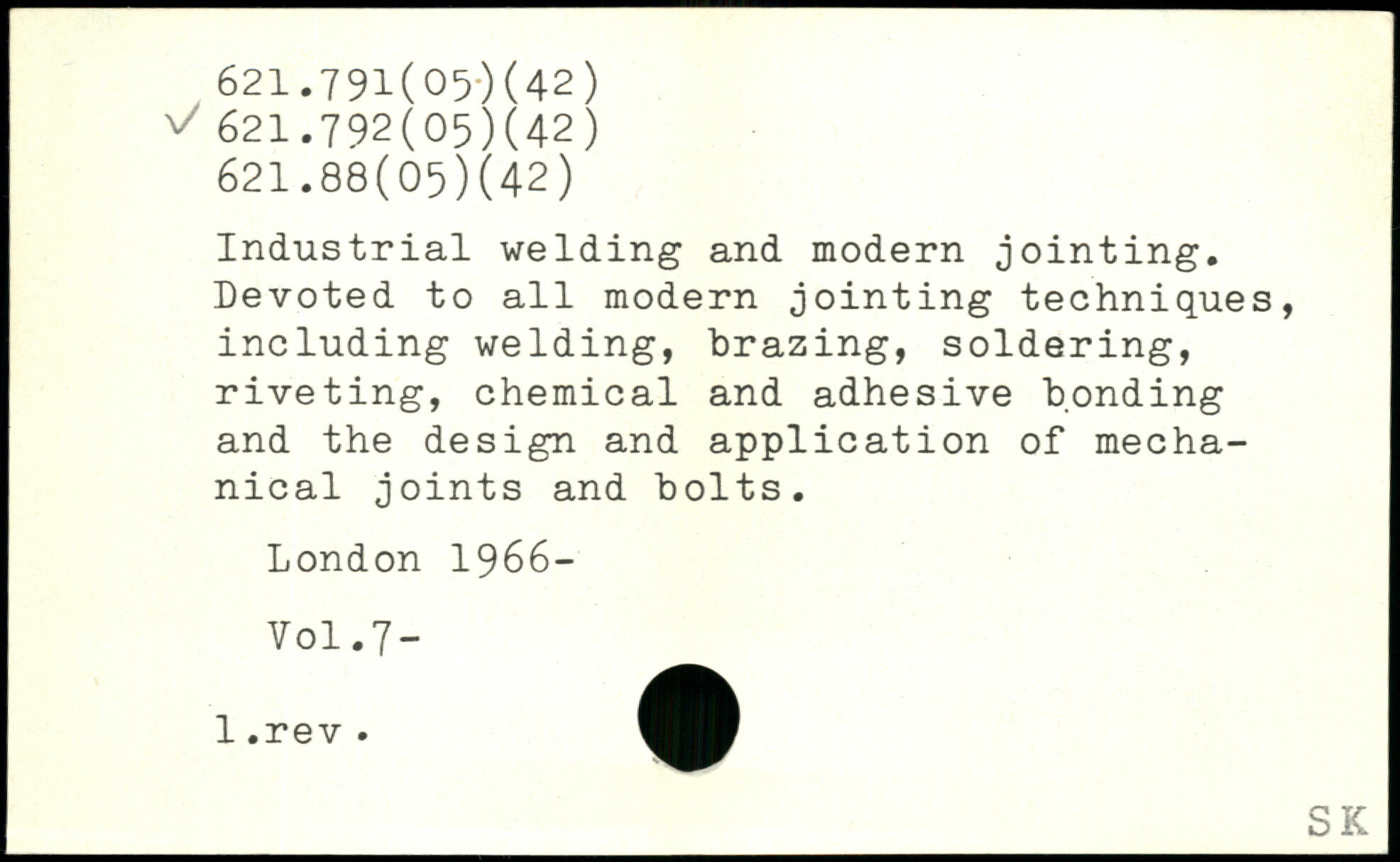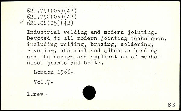 Industrial welding and modern jointing. Devoted to all modern jointing techniques, including welding, brazing, soldering, riveting, chemical and adhesive bonding and the design and application of mechanical joints and bolts.