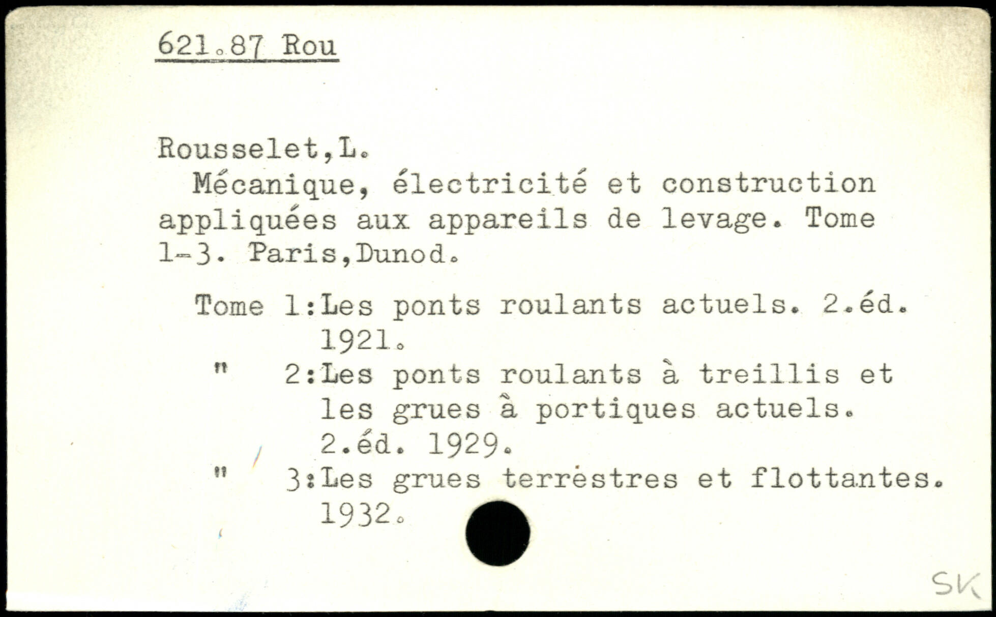 Mécanique, électricité et construction appliquées aux appareils de levage. Tome 1-3. Paris,Lunod. Tome l:Les ponts roulants actuels. 2.éd. 1921.0 n 2:Les ponts roulants a tre1111s et les grues a portiques actuels. 2.éd. 1929, H 3îLes grues terrestres et flottantes. 1932. a