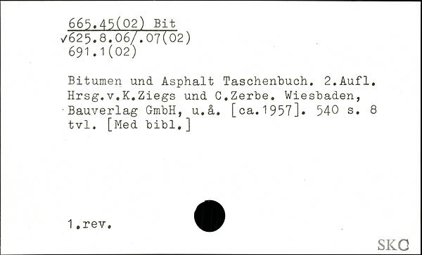 Bitumen und. Asphalt Taschenbuch. 2,Aufl. Hrsg.v.K.Ziegs und C.Zerbe. Wiesbaden, ■ Bauverlag GmbH, u.a. [ca. 1957].