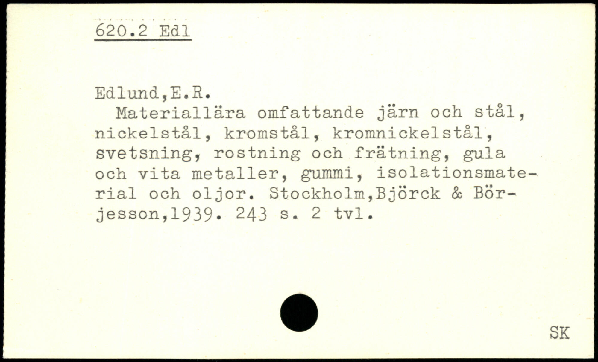 Materiallära omfattande järn och stål, nickelstål, kromstål, kromnickelstål, svetsning, röstning och frätning, gula och vita metaller, gummi, isolationsmate-rial och oljor.