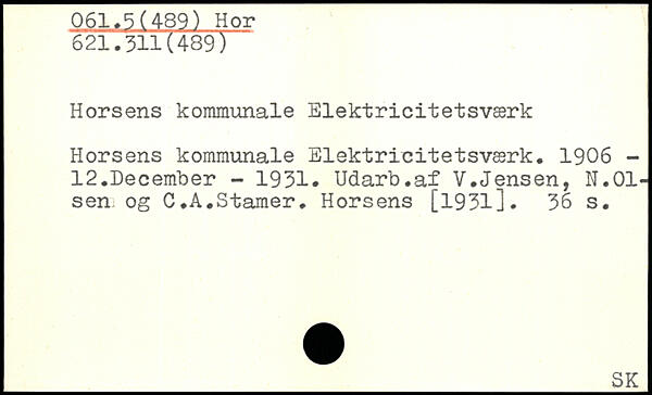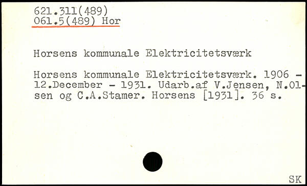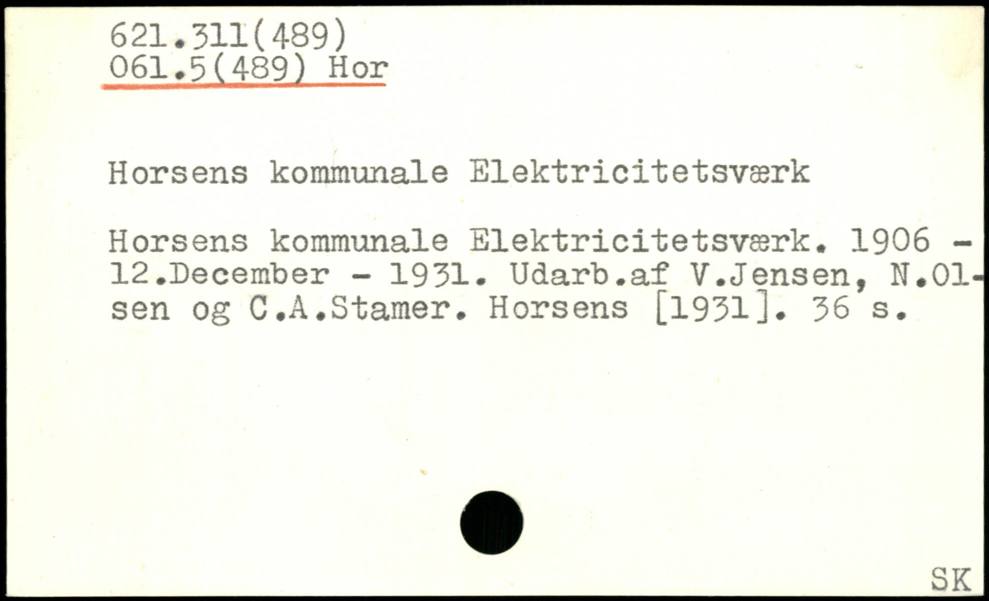 Horsens kommunale Elektricitetsværk Horsens kommunale Elektricitetsværk. 1906 -12.December - 1931. Udarb.af V.Jensen, N.Olsen og C.A.Stamer.