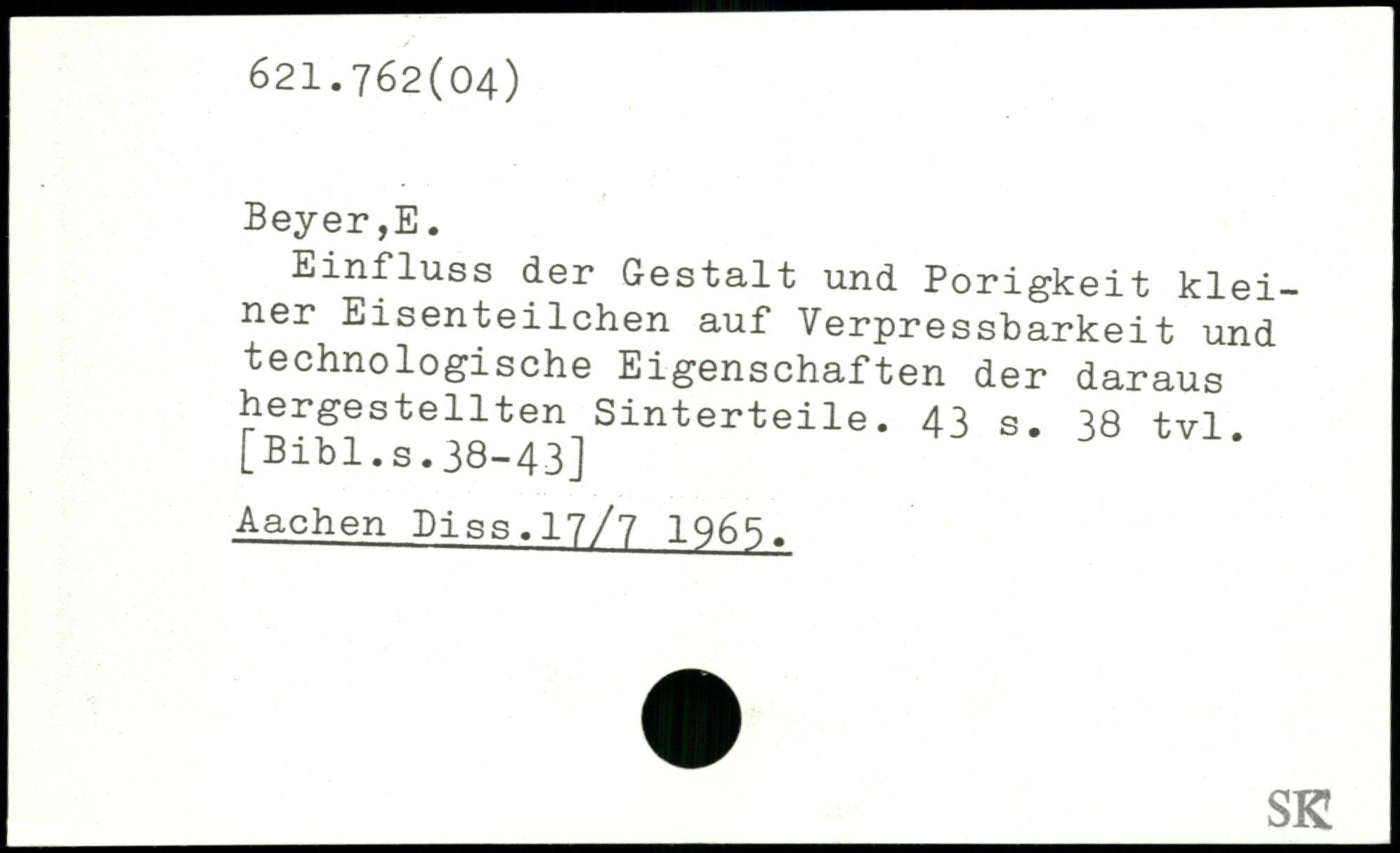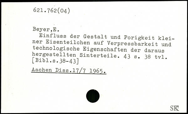 B'i^Bluss der Gestalt und Porigkeit kleiner Eisenteilchen auf Verpressbarkeit und technologische Eigenschaften der daraus hergestellten Sinterteile.