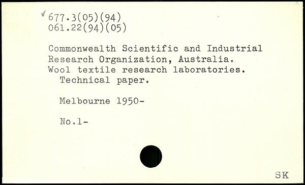 Commonwealth Scientific and Industrial i Research Organization, Australia, Wool textile research laboratories. Technical paper. Melbourne 1950- No.l-