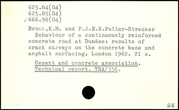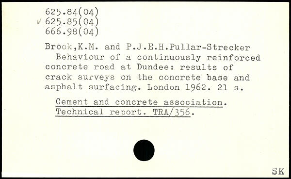 Brook,K.M. and P.J.E.H.Pullar-Strecker Behaviour of a continuously reinforced concrete road at Dundee: results of crack surveys on the concrete base and asphalt surfacing.