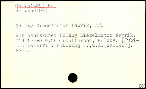 Holeby Dieselmotor Dabrik, å/S Aktieselskabet Holeby Dieselmotor Dabrik. Tidligere H.Christoffersen, Holeby. [Jubilæums skrift. Nykøbing D.,u.å.[ca.1927].