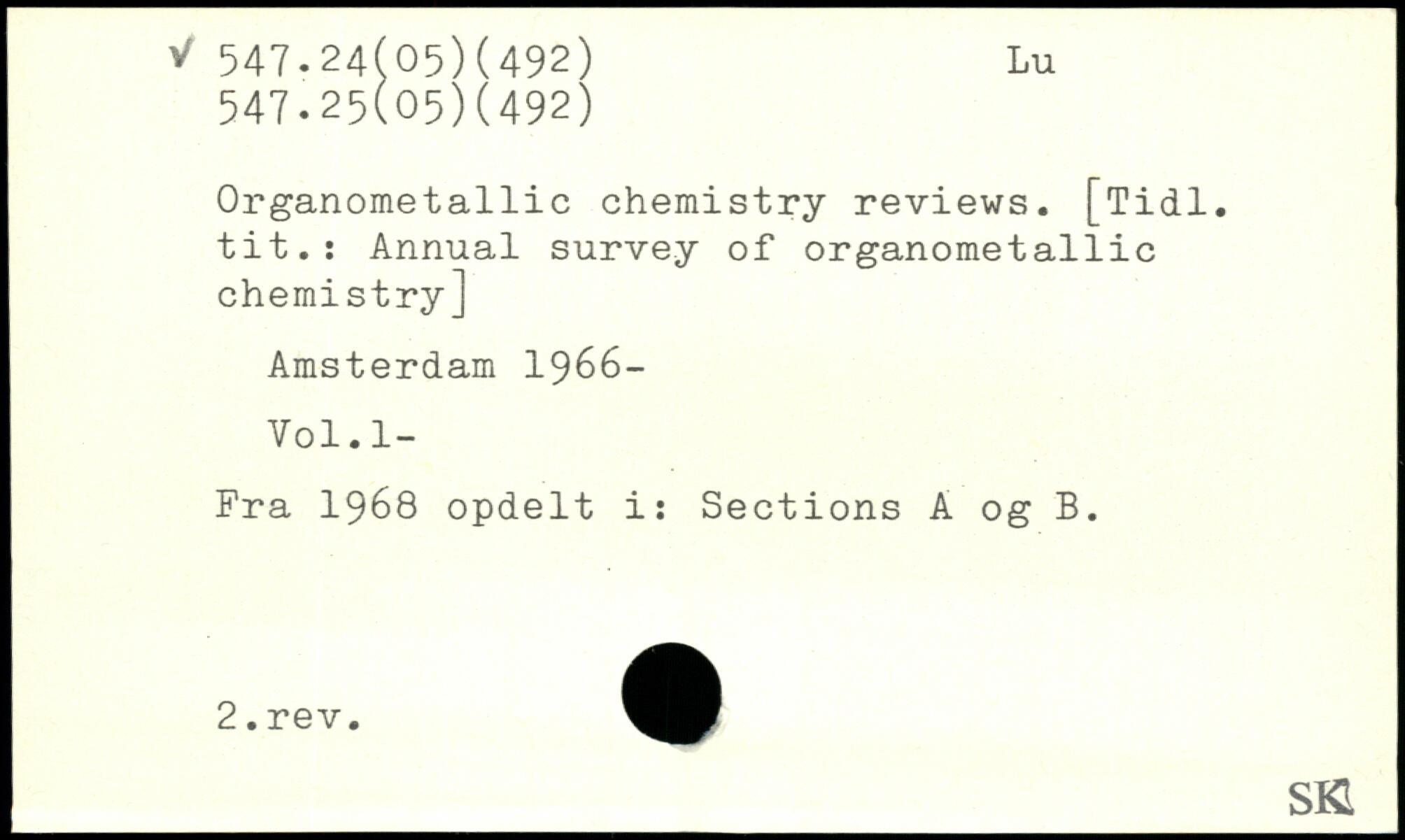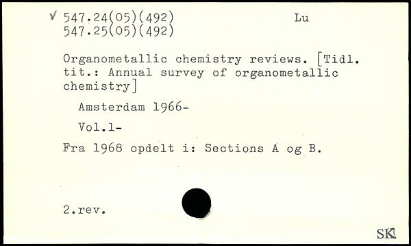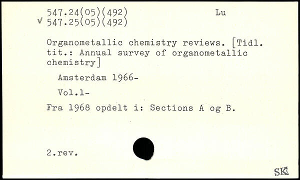 Organometallic chemistry reviews. [Tidl. tit.: Annual survey of organometallic chemistry] Amsterdam 1966- Vol.l- Fra 1968 opdelt i: Sections A 0g B. _Sft