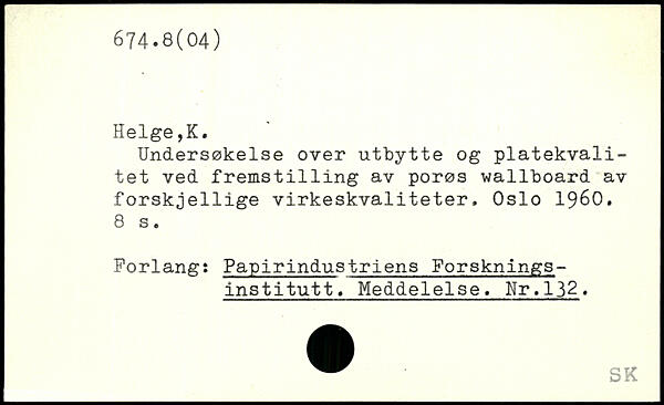 Undersøkelse over utbytte og platekvali-tet ved fremst1111ng av porøs wallboard av forskjellige virkeskvaliteter, Oslo 1960.