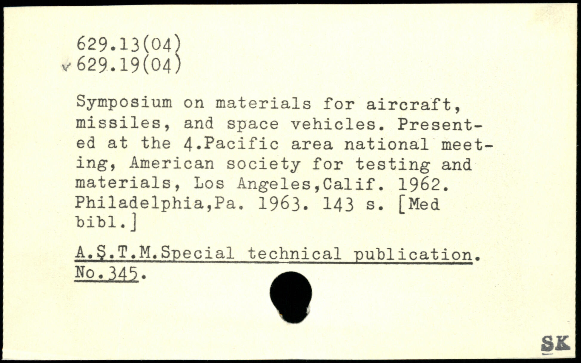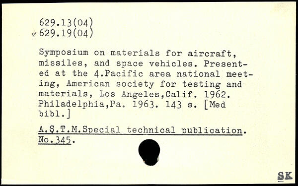 Symposium on materials for aircraft, missiles, and space vehicles. Presented at the 4,Pacific area national meeting, American society for testing and materials, Los Angeles,Calif. 1962. Philadelphia,Pa. 1963.
