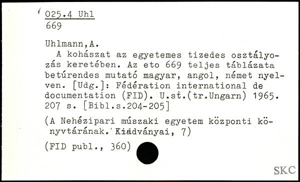 A kohaszat az egyetemes tizedes osztalyo-zas keretében. Az eto 669 teljes tablazata betürendes mutato magyar, angol, német nyel-ven.