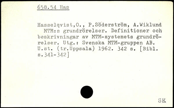 Hasselqvist,0., P.Söderström, A.Wiklund MTM:s grundrörelser. Definitioner och beskrivningar av MTM-systemets grundrörelser. Utg.: Svenska MTM-gruppen AB. U.st. (tr.Uppsala) 1962.
