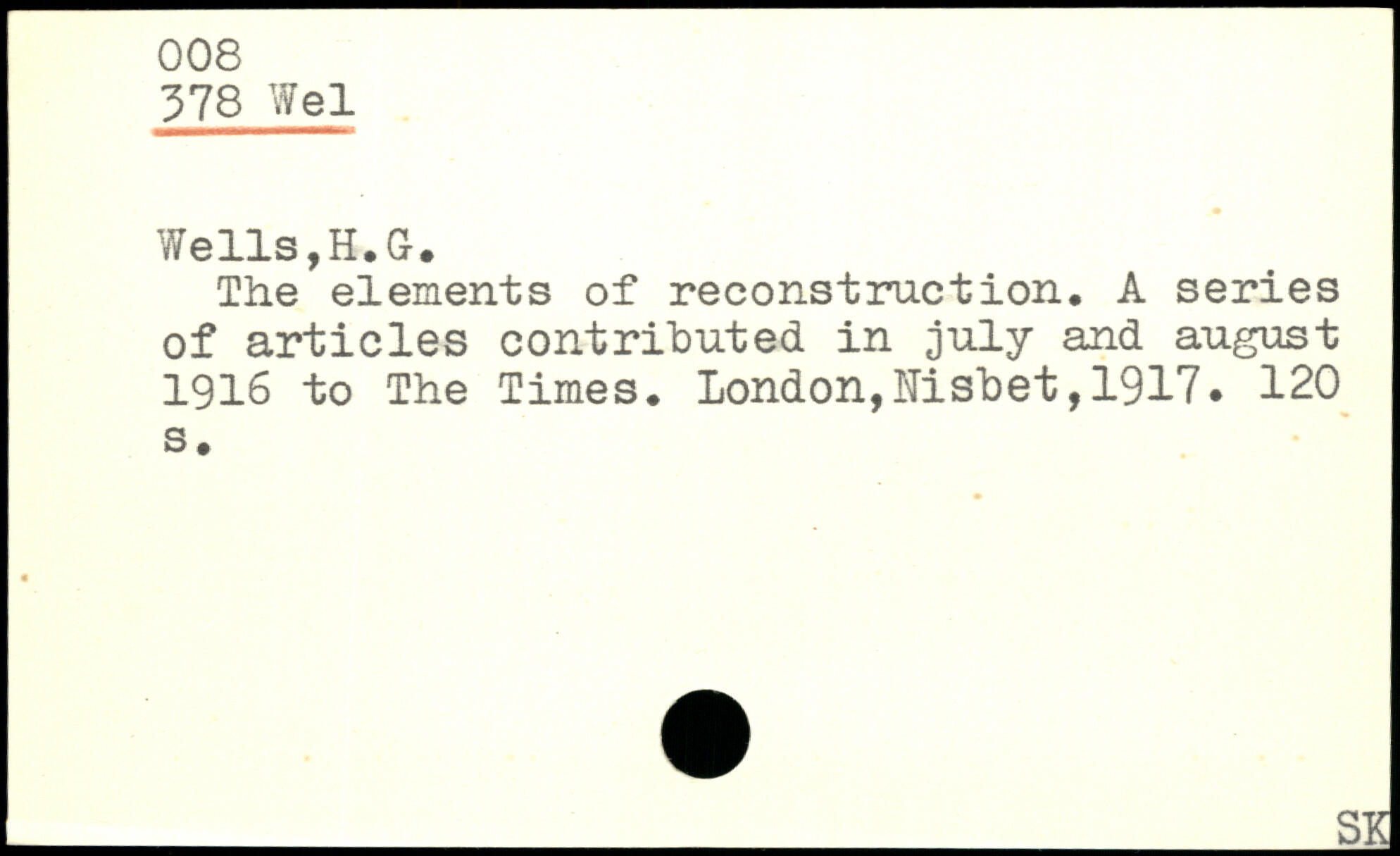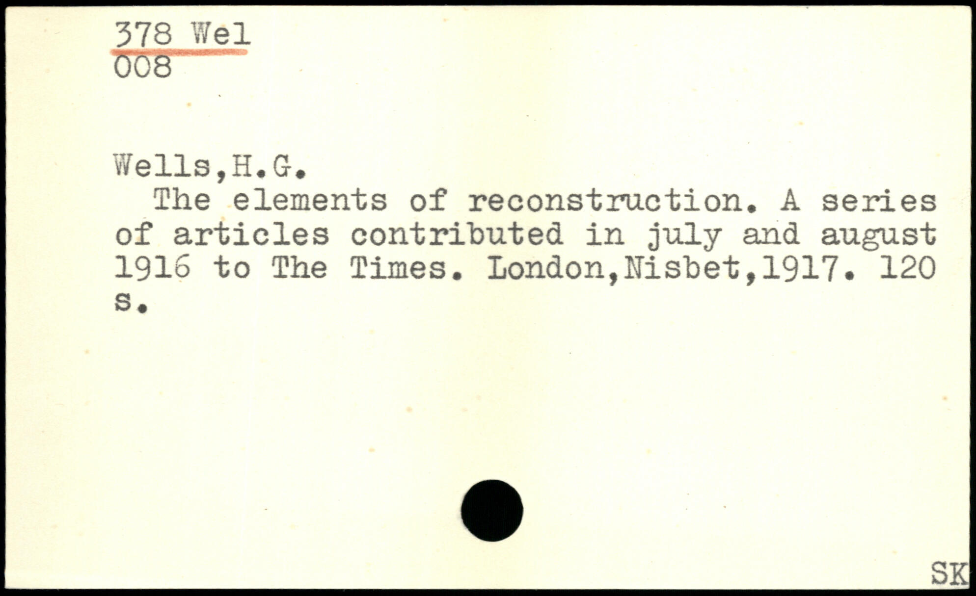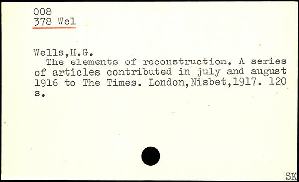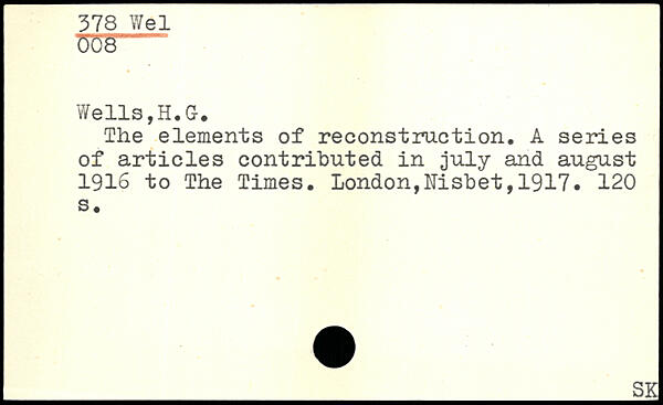 Wells,H.G. The elements of reconstruction, A series of articles contributed in july and august 1916 to The Times.