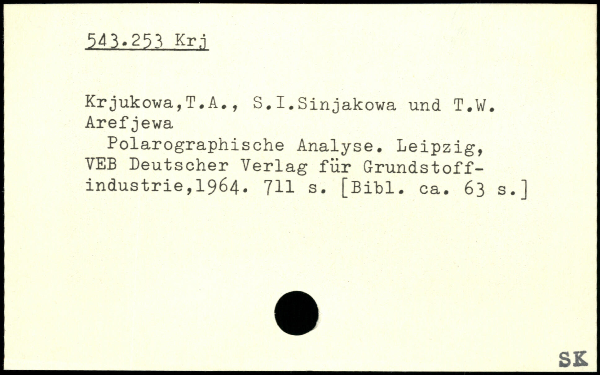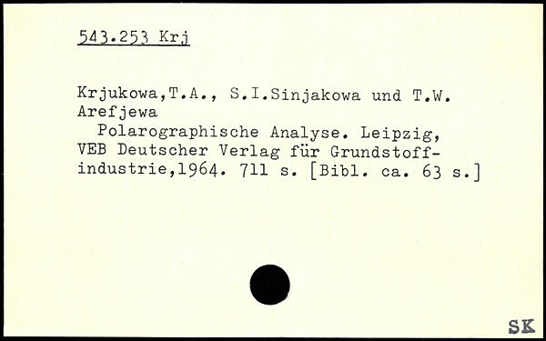 Krjukowa,T.A., S.I.Sinjakowa und T.W. Arefjewa Polarographische Analyse. Leipzig, VEB Deutscher Verlag für Grundstoffindustrie, 1964.