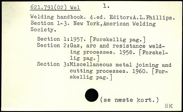 Welding handbook, 4,ed, Editor:A,L,Ph1111ps. Section 1-3, New York,American Welding Society. Section 1:1957® [Forskellig pag.] Section 2:Gas, arc and resistance welding processes, 1958. [Forskellig pag, ] Section 3sMiscellaneous metal joining and cutting processes. 1960