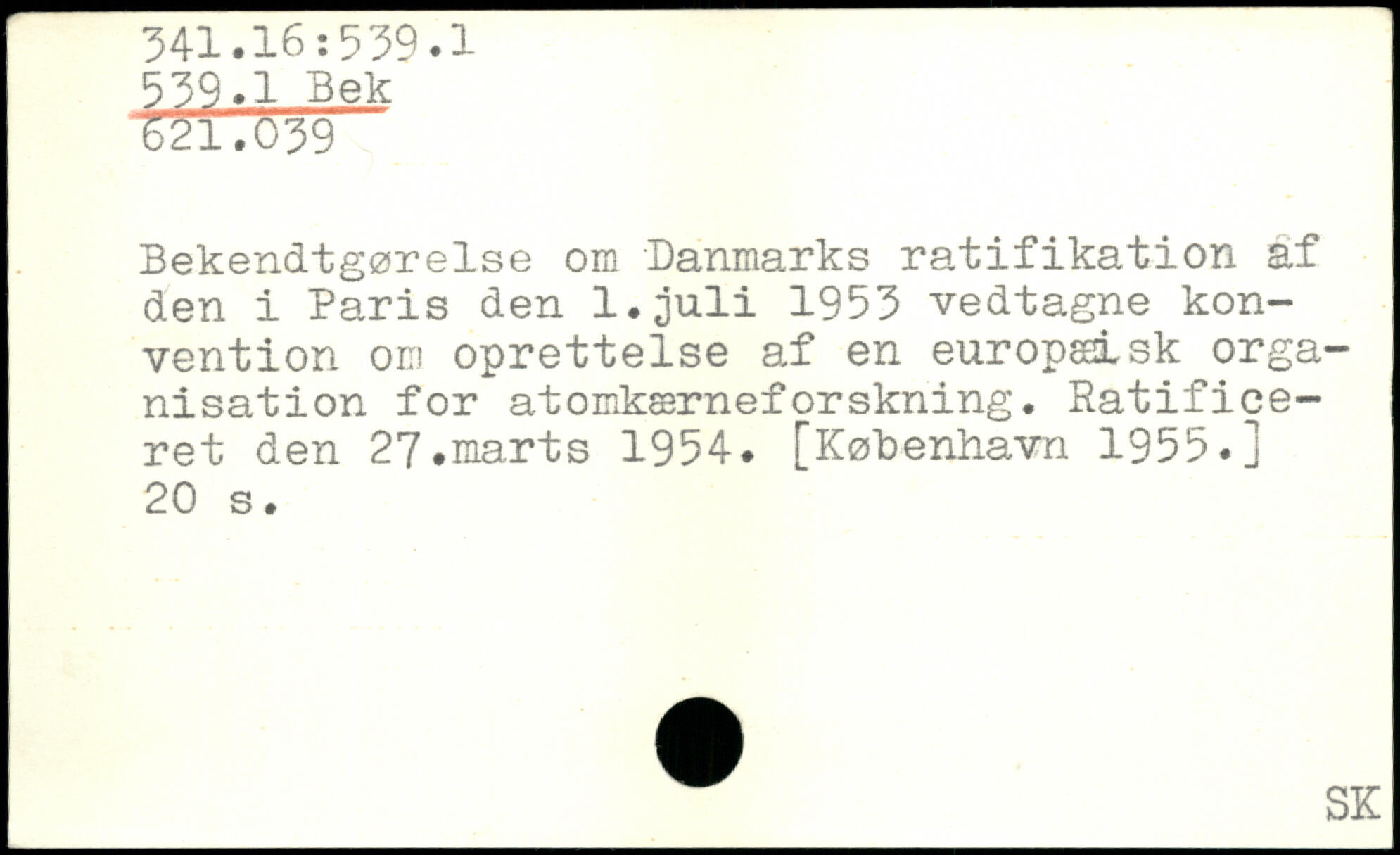 Bekendtgørelse om Danmarks ratifikation af den i Paris den l.juli 1953 vedtagne konvention om oprettelse af en europæisk organisation for atomkærneforskning. Ratificeret den 27.marts 1954.