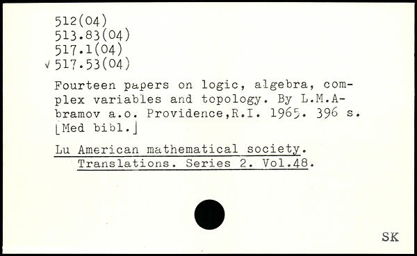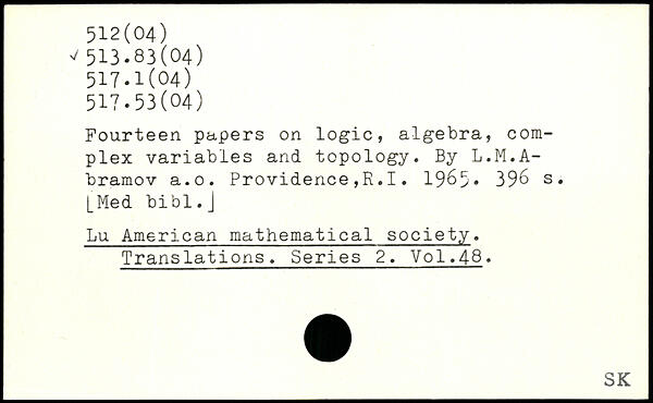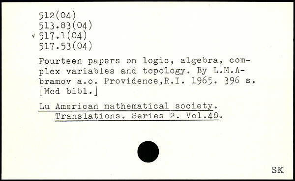 Fourteen papers on logic, algebra, complex variables and topology. By L.M.A-bramov a.o. Providence,R.I. 1965
