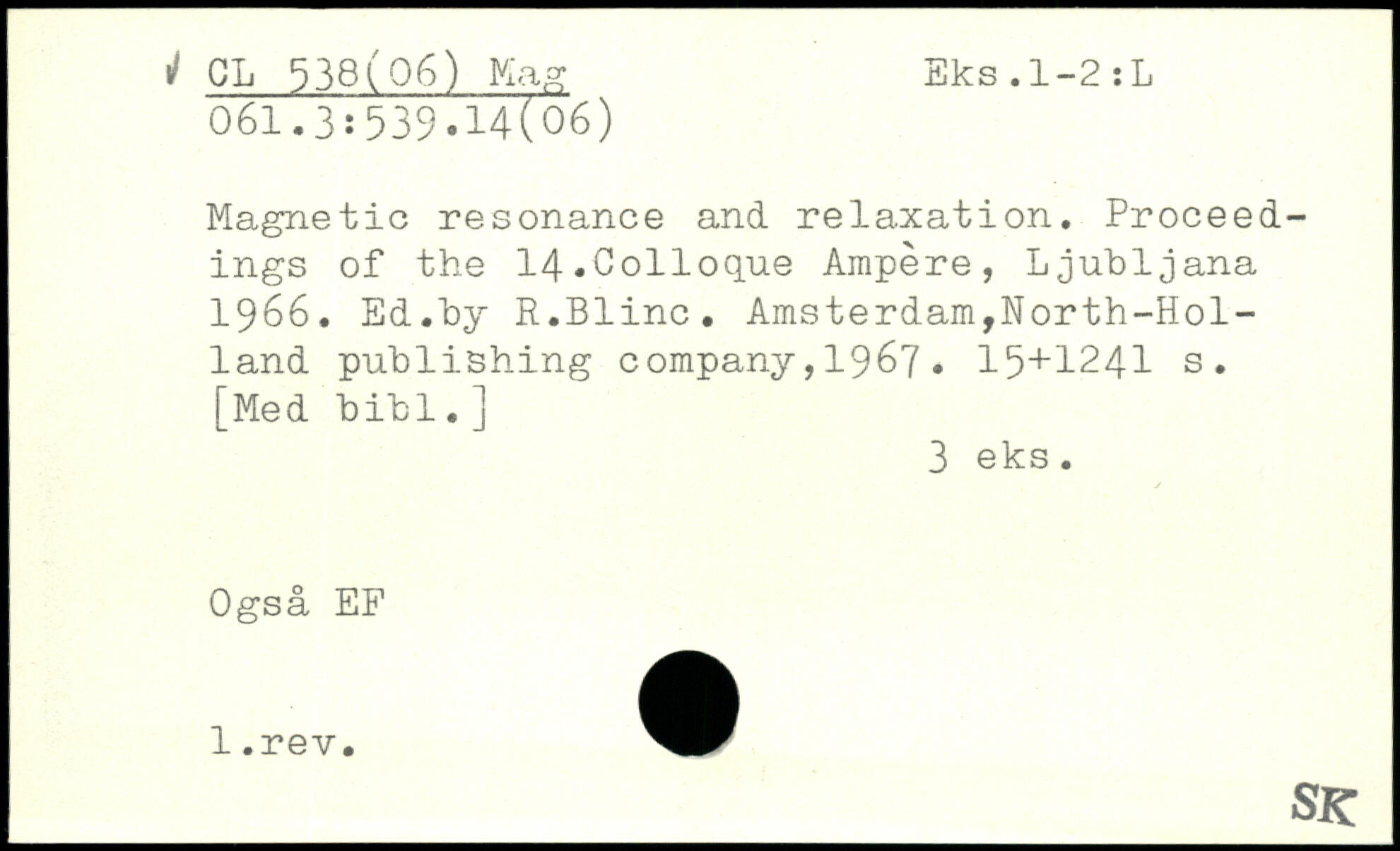 Magnetic resonance and relaxation. Proceedings of the 14.Golloque Ampere, Ljubljana 1966. Ed.by R.Blinc.