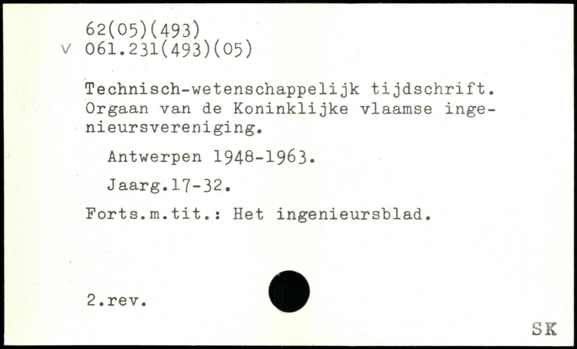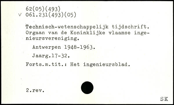 Technisch-wetenschappelijk tijdschrift. Orgaan van de Koninklijke vlaamse inge-nieursvereniging. Antwerpen 1948-1963. Jaarg.17-32. Forts.m.tit.: Het ingenieursblad.