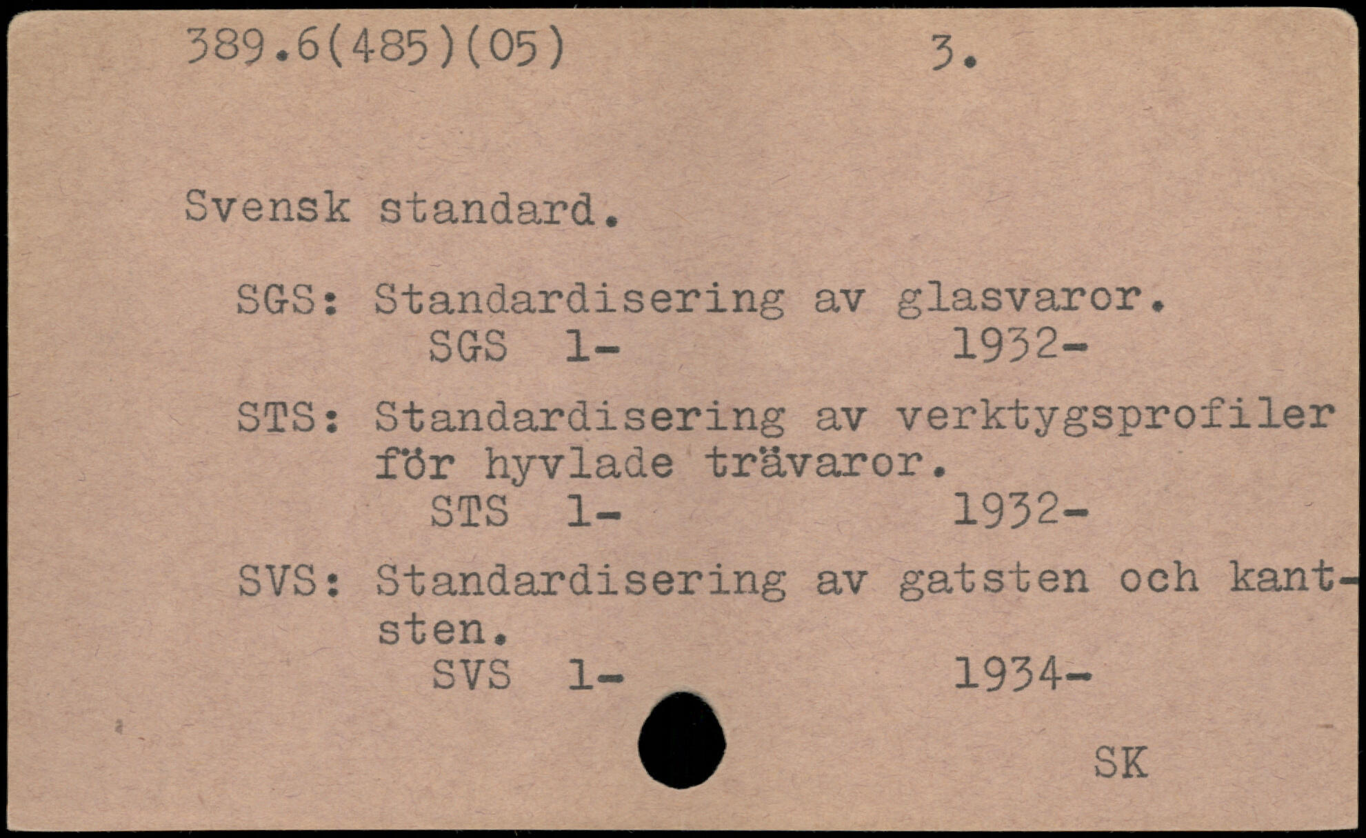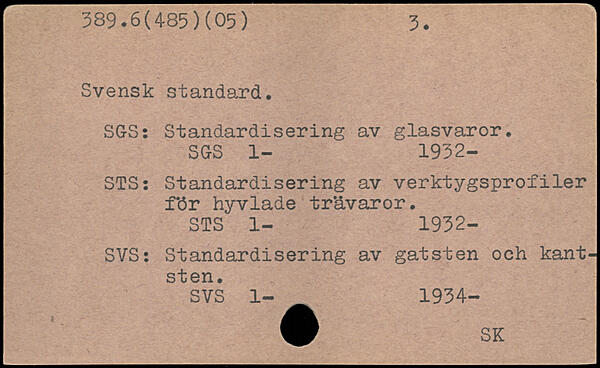 Svensk standard. SG-S: Standardisering av glasvaror. SG-S 1- 1932- STS: Standardisering av verktygsprofiler f.ör hyvlade trävaror. STS 1- 1932- SVS: Standardisering av gatsten och kantsten. SVS 1- 1934-