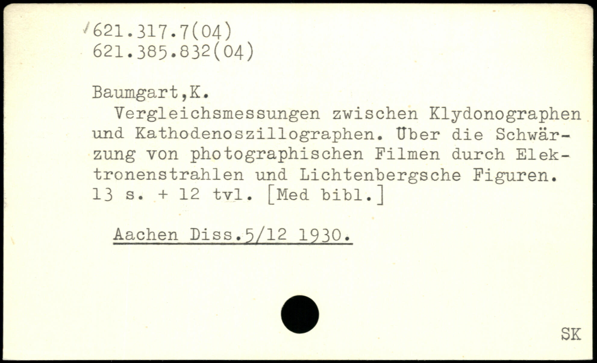 Vergleichsmessungen zwischen Klydonographen und Kathodenoszillographen. Uber die Schwärzung von photographischen Filmen durch Elektronenstrahlen und Lichtenbergsche Figuren.