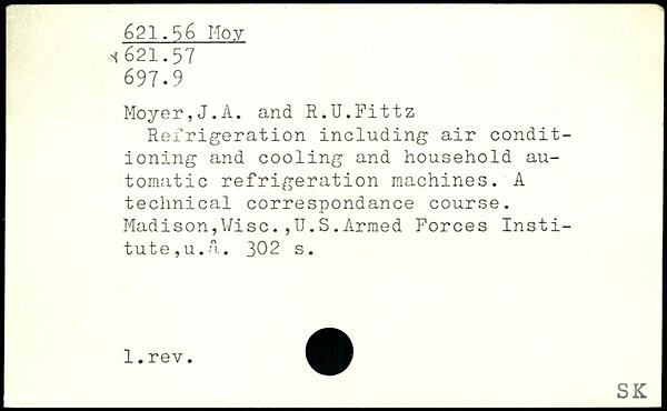 Refrigeration including air conditioning and cooling and household automatic refrigeration machines. A technical correspondance course. Madison,Vise.,U.S.Armed Forces Institute, u. a.