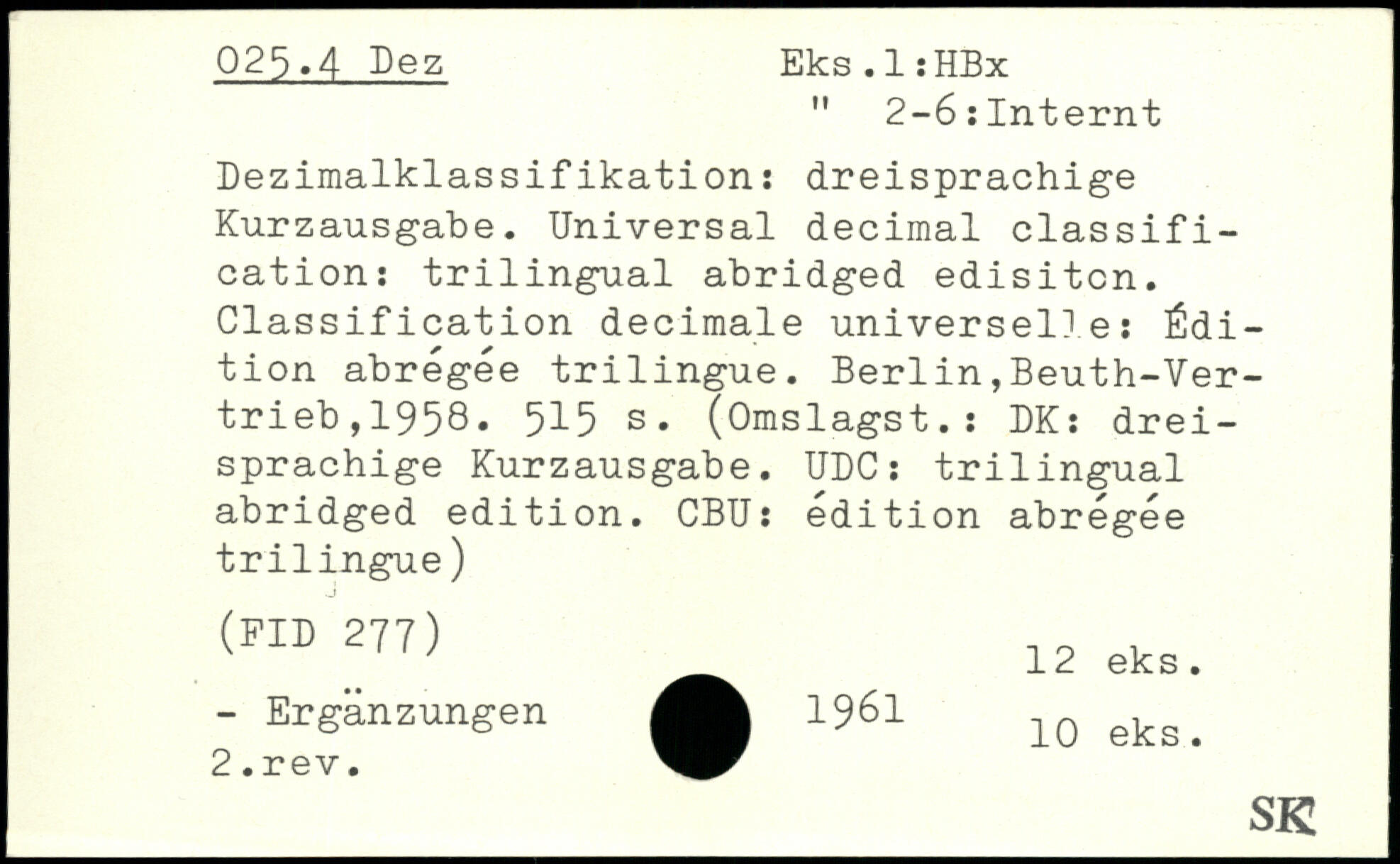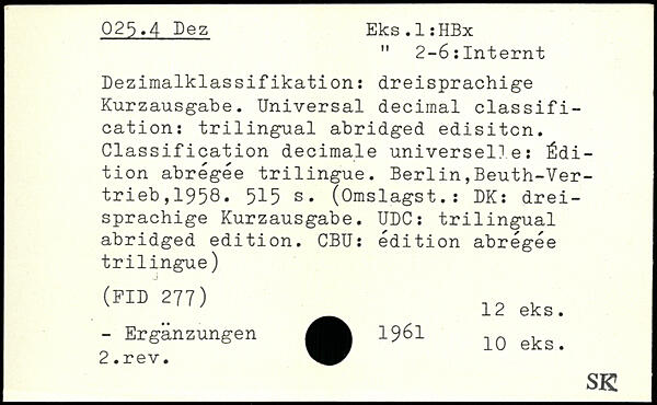 " 2-6;Internt Dezimalklassifikation : dreisprachige Kurzausgabe. Universal decimal classification: trilingual abridged edisitcn. Classification décimale universelle: Édition abrégée trilingue.