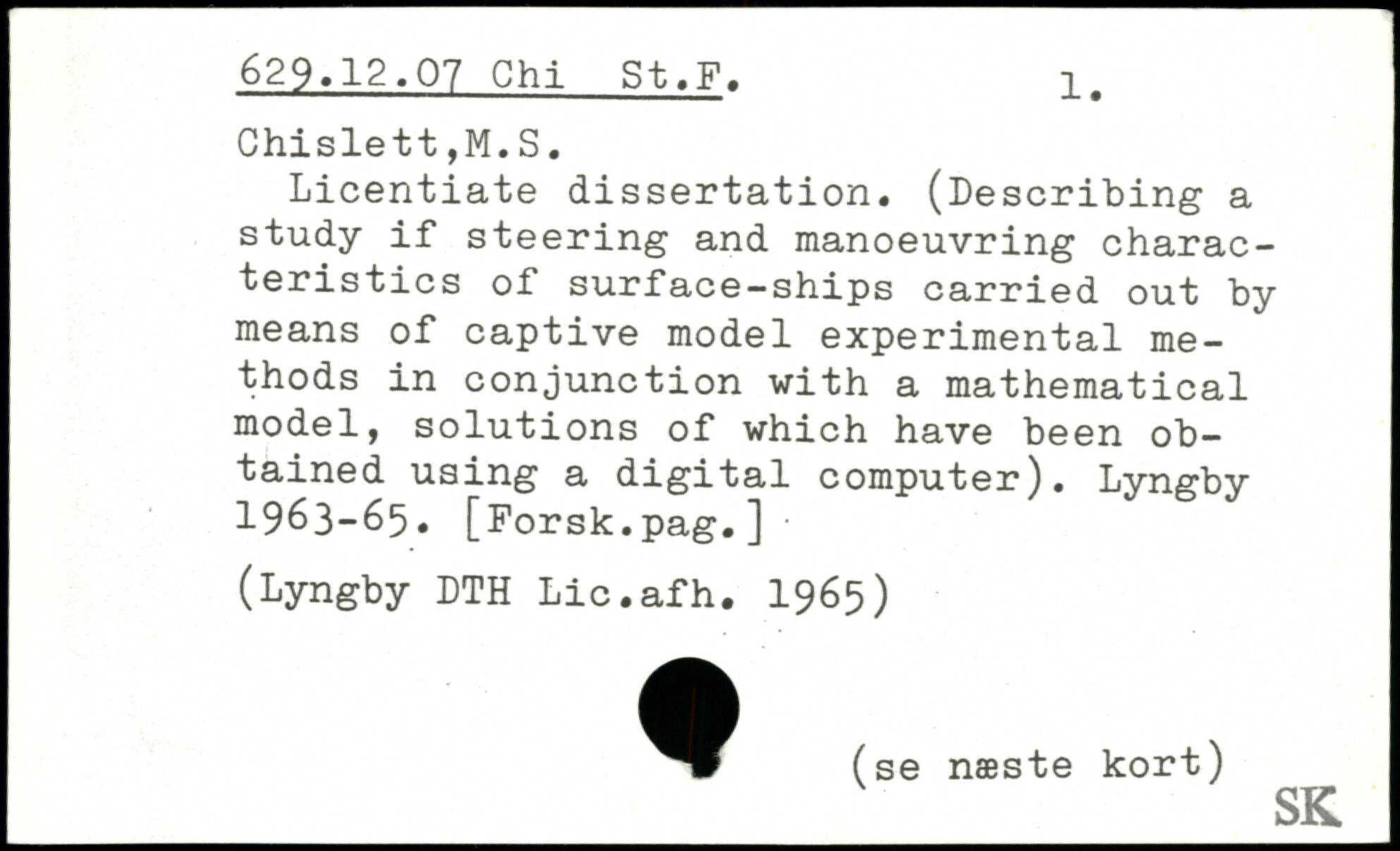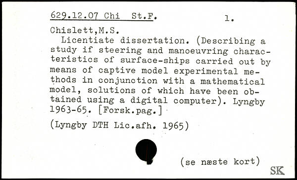 Licentiate dissertation. (Describing a study if steering and manoeuvring characteristics of surface-ships carried out by means of captive model experimental methods in conjunction with a mathematical model, solutions of which have been obtained using a digital computer). Lyngby 1963-65.